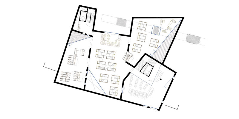 A brick pillar of the old aqueduct has been carefully integrated in the project and serves to separate one of the dormitories from a relax zone . Dormitories are organized in wide spaces and distributed over two stories. They are divided by wooden cubicles which contain beds and storage areas.
