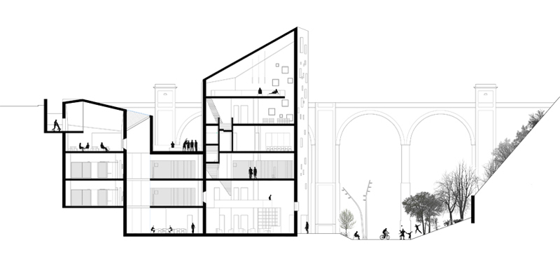 The location of the project is a peripheral area located in the Collserola hills in Barcelona called “Torre Baró” (The Baron’s Tower) and very close to an aqueduct from the 18th century. The area is currently underdeveloped and needs a regeneration. The reinterpretation of a tower as a new identity for the area has been the starting point of the concept. The exterior view of the building shows a tall concrete volume with a sloped roof.  The building consists of three volumes connected by lower one.The result is an elevated open place as a unifying element for the building.
